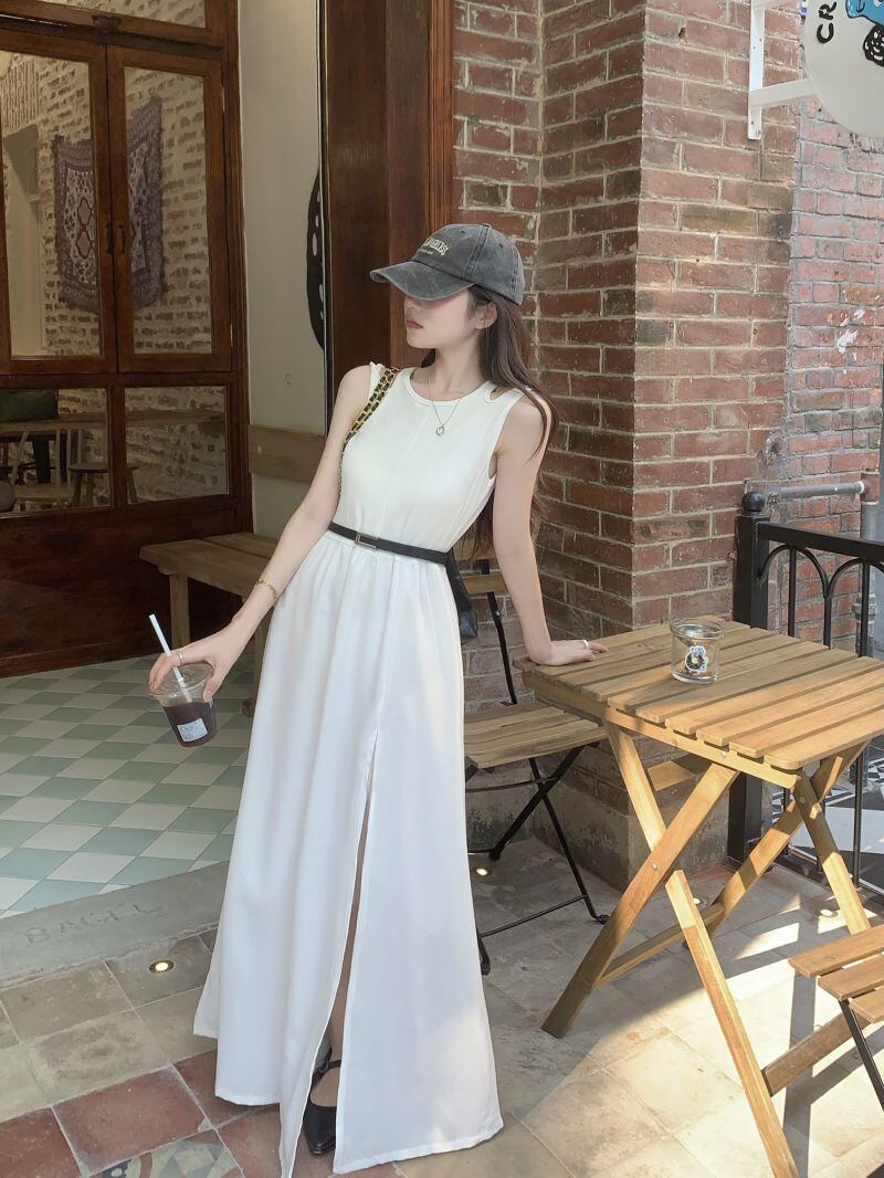 夏INS 新作 気質 透かし彫りスリット ノースリーブ ラウンドネック キャミソールワンピース